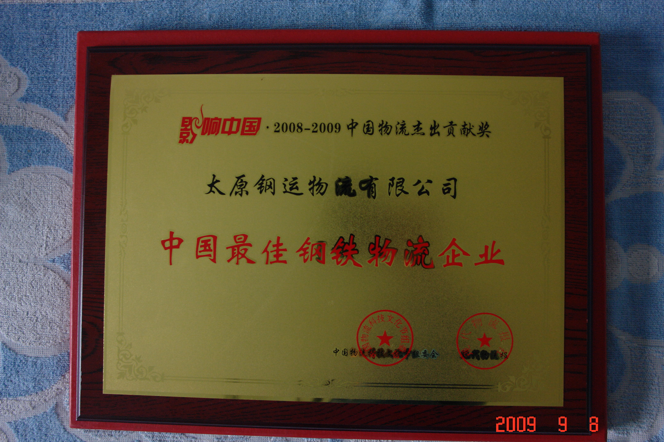 2009年9月3日,我公司在"第三屆中國(蘇州)國際物流與供應(yīng)鏈合作發(fā)展高峰論壇"暨"影響中國2008--2009中國物流杰出貢獻(xiàn)獎"表彰活動中,被授予"中國**佳鋼鐵物流企業(yè)"榮譽稱號。