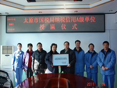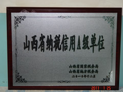 2011年1月25日,我公司榮獲省國稅、地稅聯(lián)合頒發(fā)的“山西省納稅信用A級單位”榮譽稱號。