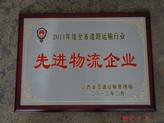 2012年2月8日,在山西省道路運(yùn)輸工作會(huì)議上,我公司獲得由山西省交通運(yùn)輸管理局頒發(fā)的2011年度全省道路運(yùn)輸行業(yè)《先進(jìn)物流企業(yè)》榮譽(yù)稱號。