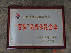 2012年2月8日,在山西省道路運輸工作會議上,我公司獲得由山西省交通運輸廳頒發(fā)的山西省道路運輸行業(yè)《“百佳”品牌示范企業(yè)》榮譽稱號。