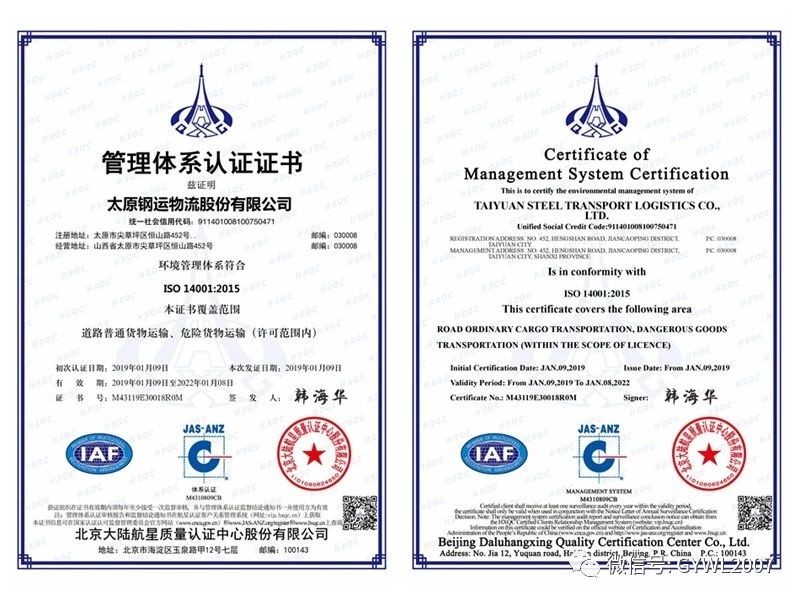 2019年1月,公司通過ISO9001質(zhì)量管理體系、ISO14001環(huán)境管理體系、ISO18001職業(yè)健康安全管理體系認(rèn)證。ISO三標(biāo)一體認(rèn)證的通過,標(biāo)志著公司始終踐行推進(jìn)冶金物流服務(wù)本質(zhì),持續(xù)強(qiáng)化以用戶為中心的服務(wù)理念;充分反映公司全力打造綠色****物流企業(yè)發(fā)展規(guī)劃的堅(jiān)定決心,同時(shí)通過提高職業(yè)健康安全管理水平、優(yōu)化管理流程、完善管理體系、規(guī)范作業(yè)標(biāo)準(zhǔn)等手段提升公司競爭力,為公司開拓市場、永續(xù)發(fā)展提供了有力保障。